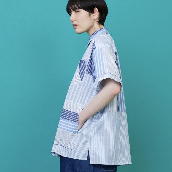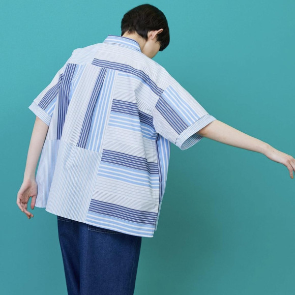 材料:像4個條紋圖案對接一樣的原創麵團以適度的彈性和清爽的觸感為特徵。棉所具有的獨特柔軟的手感與聚酯的清涼感相結合,不易皺紋,與通常的棉質相比,更容易乾燥也是重點。在那裡組合了不同的條紋布料,呈現出複雜的外觀。